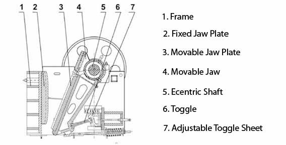 Main components of jaw crusher is consist of main frame, eccentric shaft, driving wheel, fly wheel, side protecting plate, toggle, toggle seat, gap adjustment rod, reset spring, fixed jaw plate and movable jaw plate. Toggle plays role of protection.